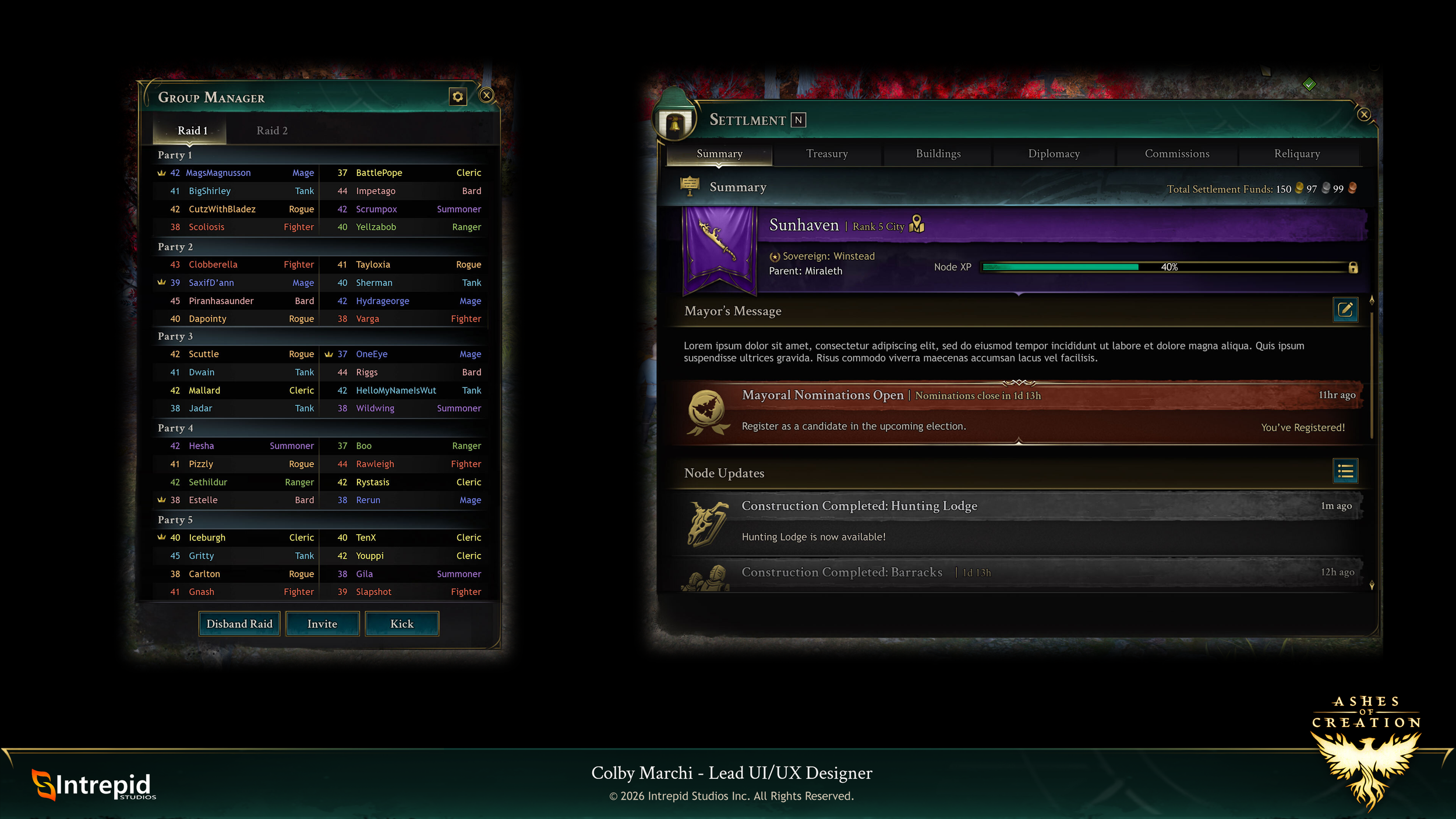The Settlement Menu was a vital part of the settlement system in Ashes of Creation. Settlements are player run hubs that required coordination for materials, gold, experience, and progression. This menu housed vital information for a variety of systems: Summary, treasury, building info, building upgrade system, settlement to settlement diplomacy, and relic storage and application.